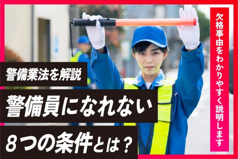 今までの経験や自分の特性などを活かして警備員の仕事をしたいと思っている方もいるのではないでしょうか。その時に、自分が警備員になれるかどうか気になることもあるでしょう。 本記事では、警備員になれない主な欠格事由と、誤解され … 続きを読む 【警備業法を解説】警備員になれない8つの条件とは?欠格事由をわかりやすく説明します